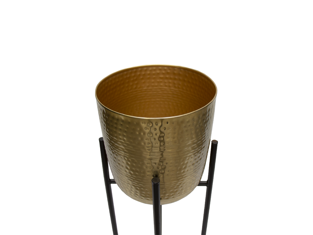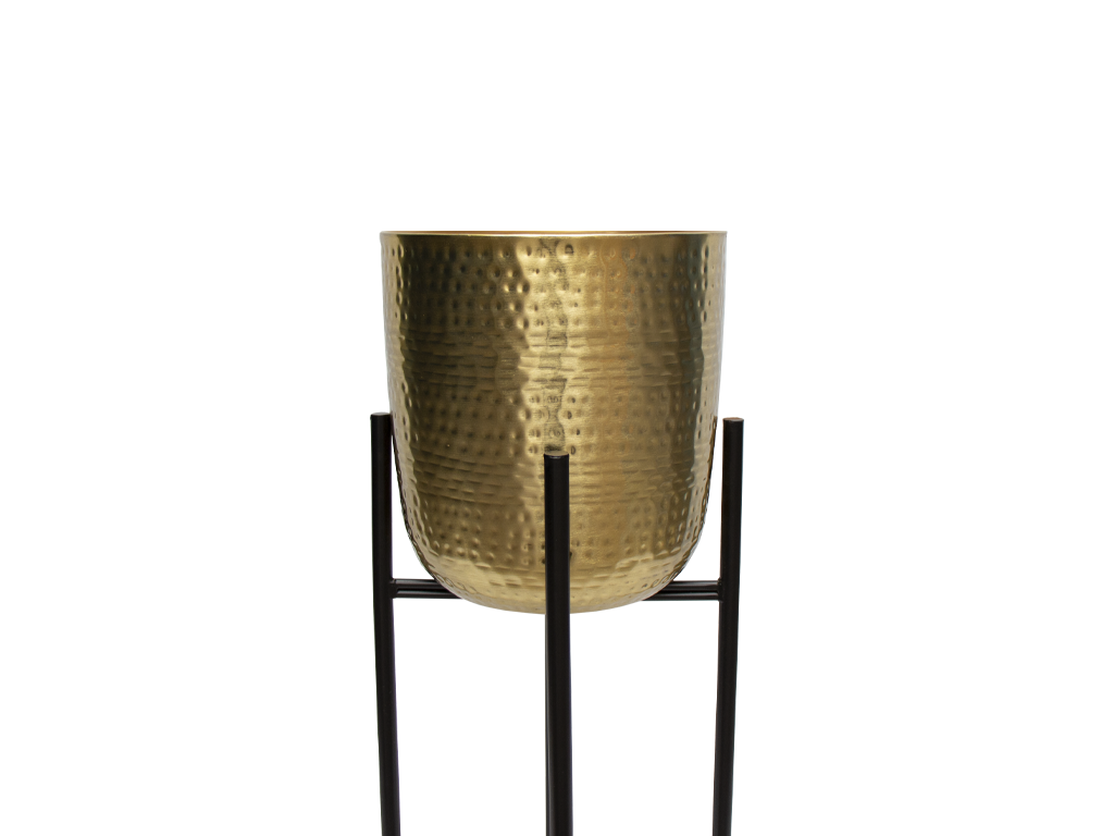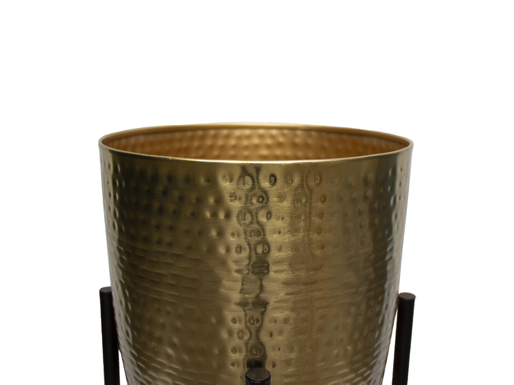 La Maceta posee una silueta con delicados martilleados a mano que refleja una textura que juega con la luz, creando destellos sutiles que enriquecen cualquier espacio. El soporte estructural, con líneas minimalistas y un diseño geométrico, eleva la maceta, otorgándole una presencia ligera pero firme. Ideal para destacar plantas de gran porte o flores delicadas, esta maceta no solo embellece el entorno, sino que se convierte en un elemento decorativo por derecho propio, aportando un aire sofisticado y atemporal.