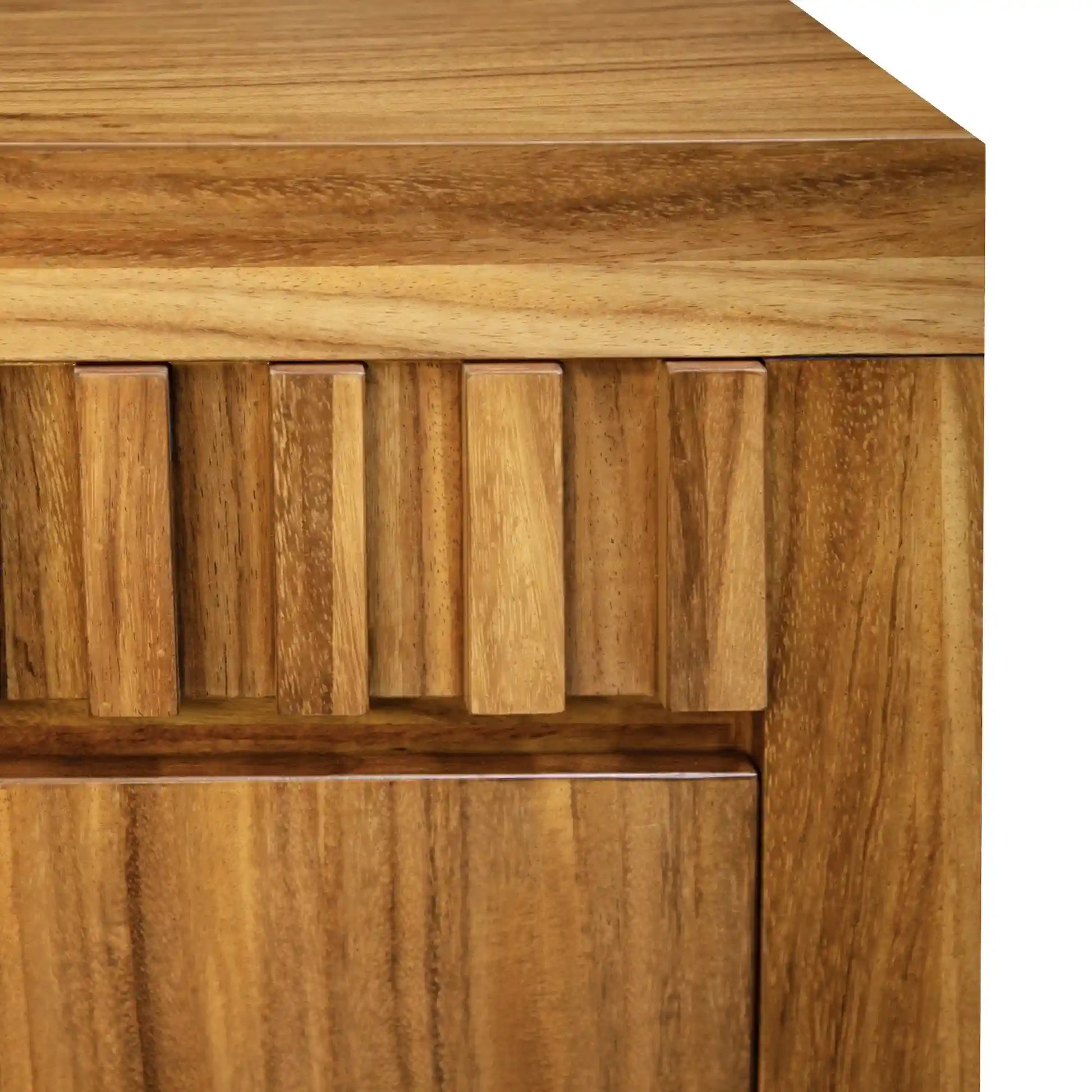 El Mueble de TV Montreal es una pieza robusta y elegante. Sus paneles frontales destacan por un diseño estriado que añade textura y sofisticación, mientras que el amplio espacio central, con estantería ajustable, ofrece una solución práctica para organizar dispositivos electrónicos o decoraciones. Su tono cálido y vetas pronunciadas le otorgan un carácter único, convirtiéndolo en el complemento ideal para salas modernas que buscan incorporar un toque de naturaleza y diseño contemporáneo en un solo mueble.